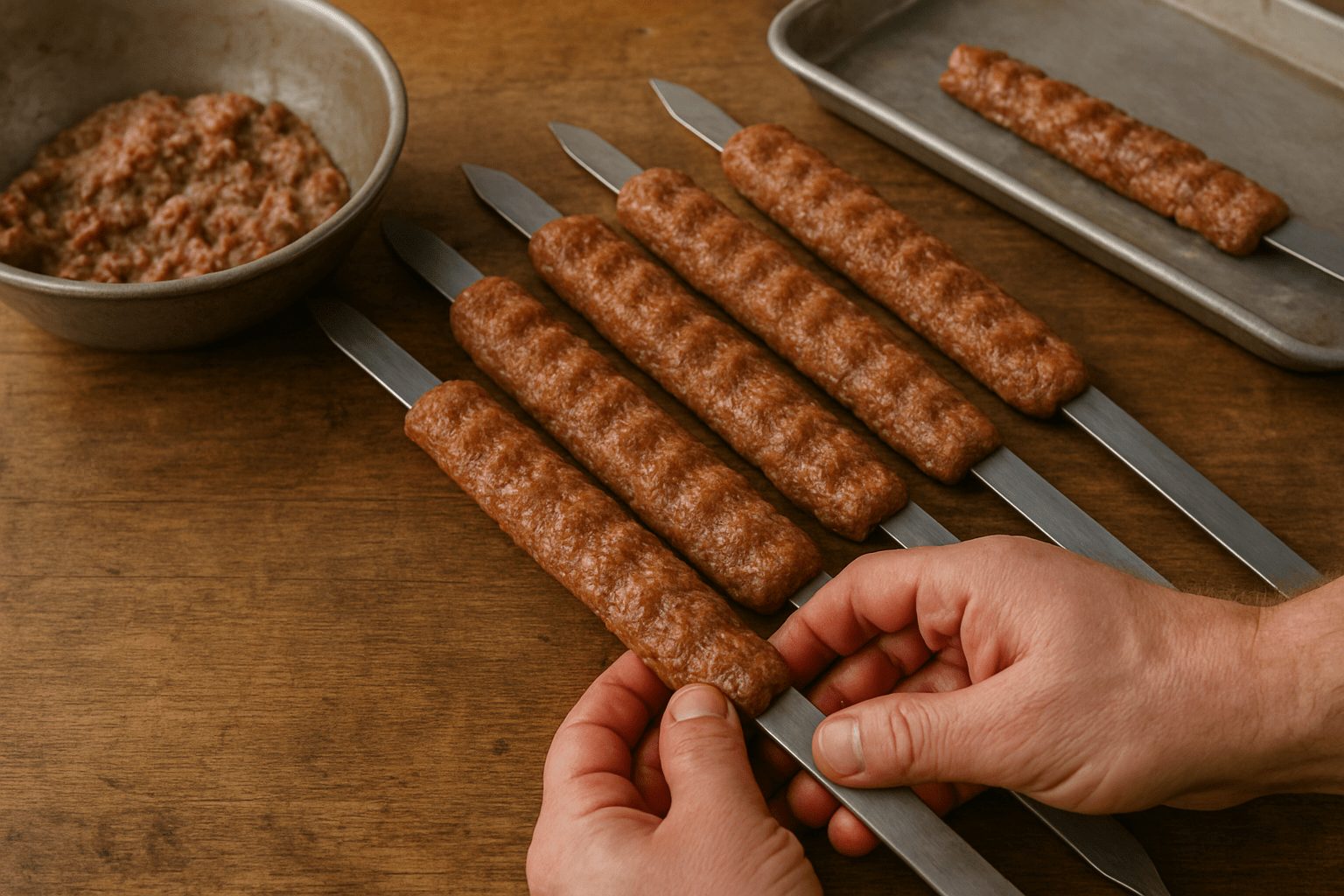 ابتدا گوشت را بهصورت یک توپ جمع کنید، سپس از بالا روی سیخ فشار دهید تا در امتداد آن باز شود. با انگشت شست و اشاره، حرکات ضربهای ملایم از بالا به پایین انجام دهید تا گوشت کاملاً بچسبد.